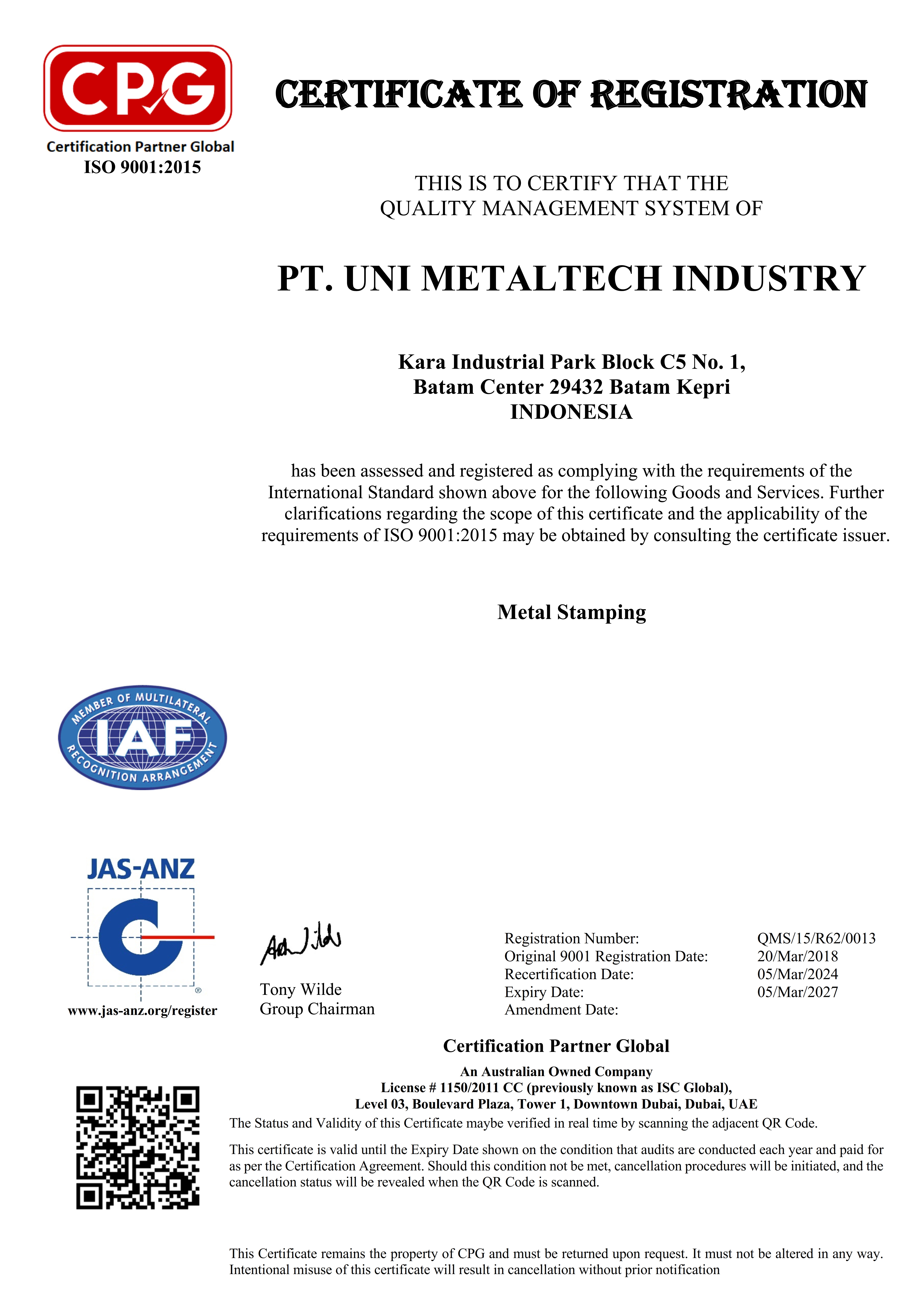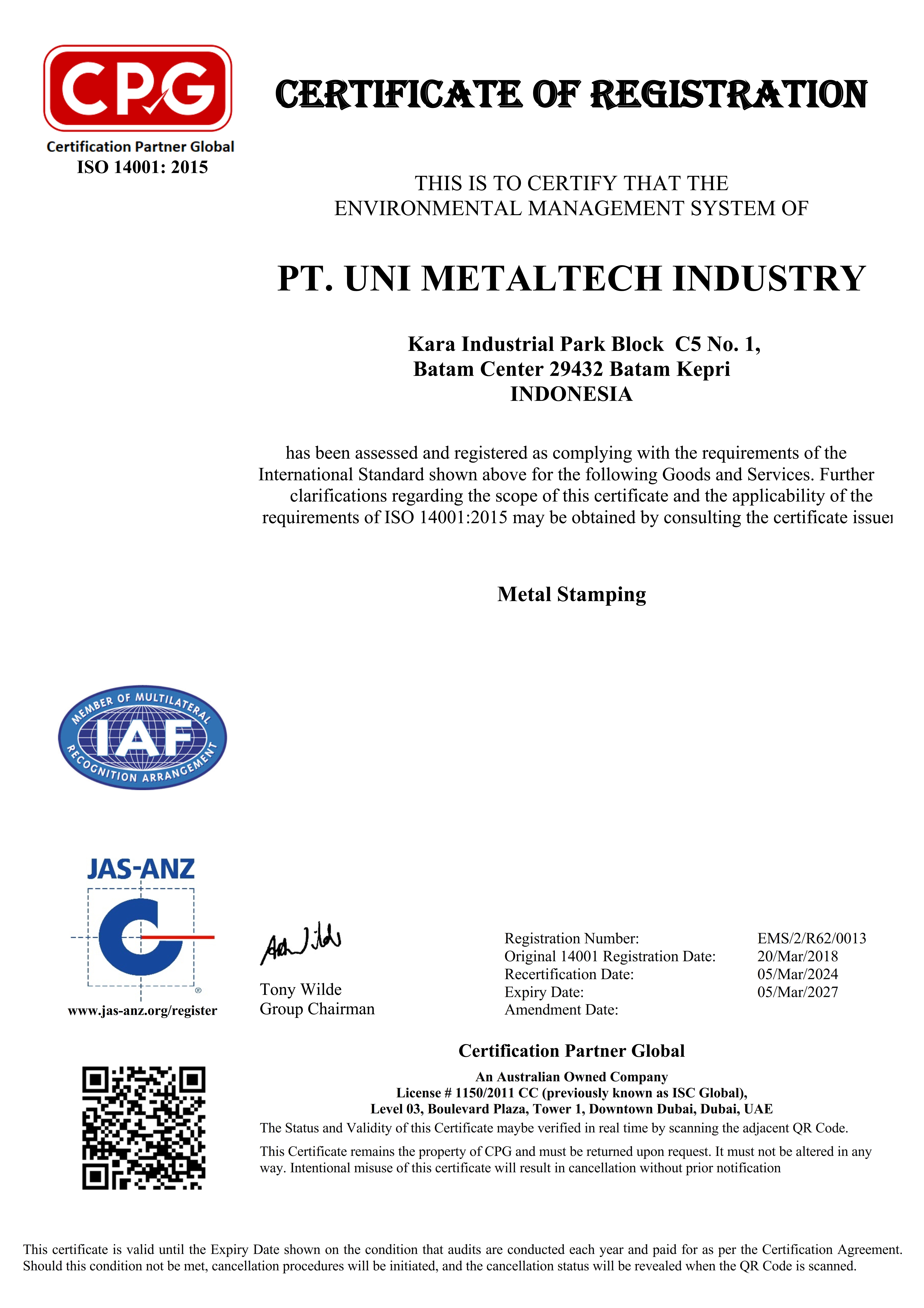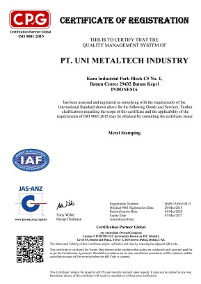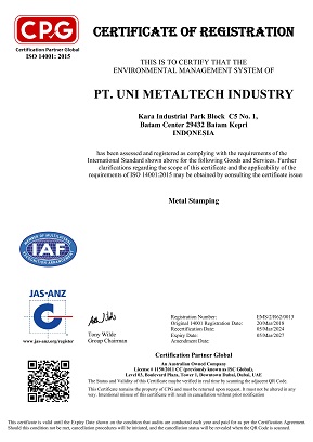 PT. UNI METALTECH INDUSTRY (UMI) is a precision metal stamping company and incorporated in year 2000 in Batam - Indonesia. It is located at Kara Industrial Park - Batam center. A short distance from Singapore Batamindo Industrial Park and International Ferry Terminal - Batam center